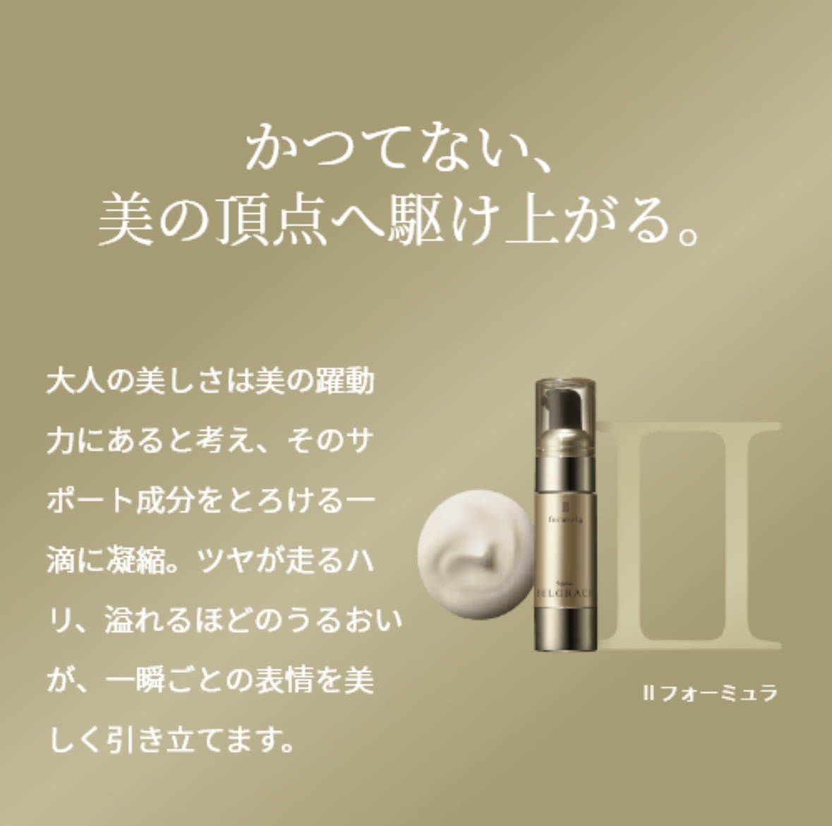 「Iフォーミュラ」を使用した後に、「IIフォーミュラ」を使用。<受け入れて応えられる肌へ。ジェル状の「Iフォーミュラ」がみずみずしく肌を潤し、セラム状の「IIフォーミュラ」がやさしく肌を包み込みます。
